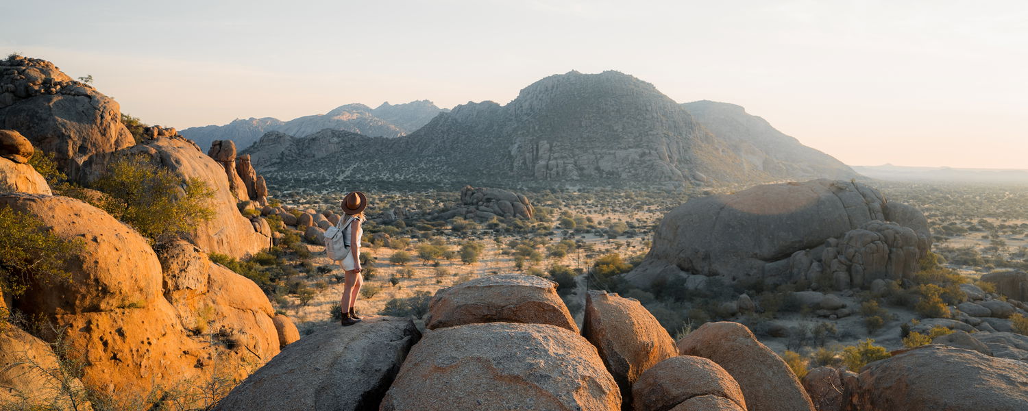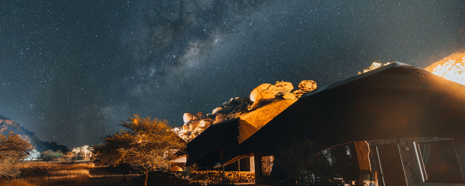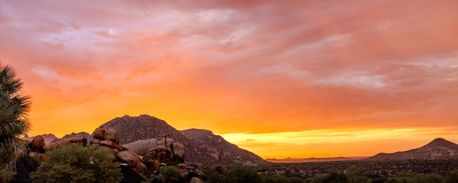 The thatched African inspired chalets are made up of twin rooms and are set against towering granite formations. Large windows frame the distant Erongo foothills and invite the outside in. The room is very comfortable with a small lounge area and a tea and coffee station. I settle on my verandah with a book, taking in the sounds and smells of the bush. Lizards and rock agama are scurrying around as I look out over the wilderness. Mountain, desert and Savannah ecosystems converge in this surreal environment and rare and adapted plant, bird and animal life thrive here.