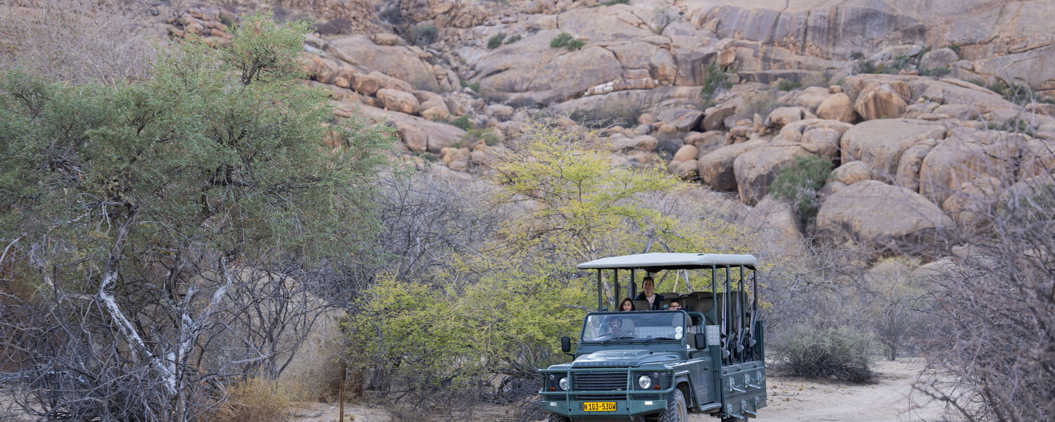 Three and a half hours from Windhoek you enter the Erongo Mountain Nature Conservancy. The gravel road to the Ai-Aiba -The Rock Painting Lodge is spectacularly flanked by the Erongo Mountain range. Massive boulders strewn across the landscape along side strange rock formations are remnants of an ancient volcanic complex.