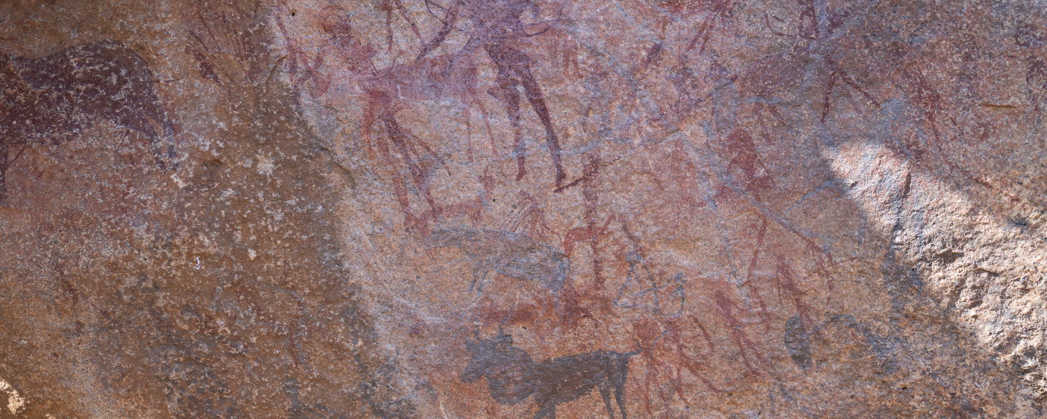 We are taking the Moringa belt drive to our sundowner spot, so-called because of the stark presence of this strange shaped tree with its swollen base rising out of the rocky crevices. Kules explains that the tree is known for its medicinal properties and that the San people would collect its watery sap. An Oryx in the distance is framed by precariously balanced red rocks and some Hartmann's Mountain Zebra seem unperturbed by our presence. Our last stop is a rocky arch formation now glowing yellow in the late afternoon light. Ancient hunters with bows are depicted stalking kudu. It's the magic hour and the mountains in the distance are shaded in purple. The jagged rock faces and huge boulders are coloured in red and orange light and take on a different form. I can't imagine a better place for sundowner.