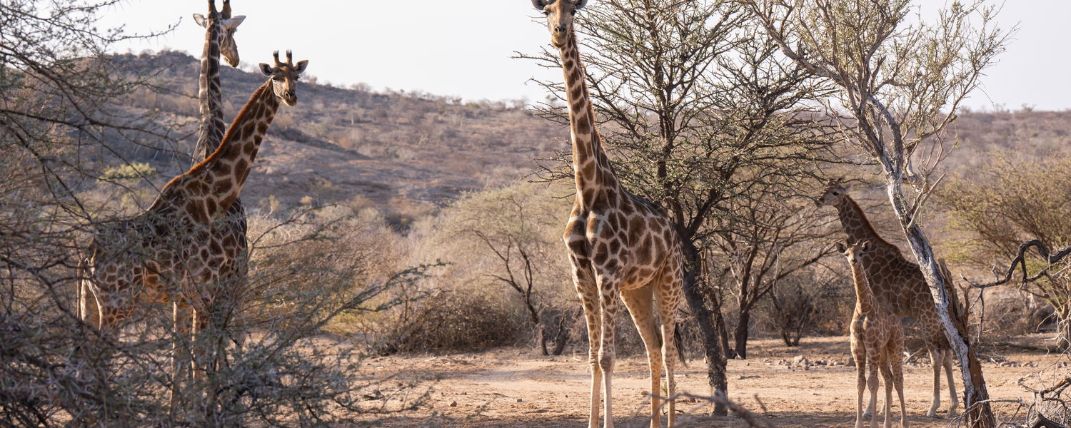 Before leaving for sundowners we relax in the shade of the palms next to the pool and take our binoculars out to look down at some steenbok drinking at the watering hole. Our guide Kules welcomes us on a scenic drive but we are impressed by the amount of wildlife we encounter on our way to the first rock painting site. The late afternoon light adds an element of magic to this already otherworldly landscape. A dik-dik one of Namibia smallest antelopes is hiding in the shrub. Kules tells us this species is monogamous and we should look out for its mate. The birders on our vehicle spot three of the five species of Hornbills found at the lodge. A pair of Verreauxs' Eagles are catching thermals above the cliff hangs as we stop to look at some very rare fine-line rock art. The whitened image of two giraffe is at least 2000 years old, and according to our very knowledgeable guide, were a sign of the presence of water. The area around the lodge has more than 204 identified sites which are incredibly well preserved.
